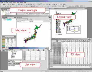 時空間データを扱う分野は少なくありませんが、こういった分野における調査解析は幾つかのコンピュータソフトを横断的に使って進められるのが一般的でした。空間データ(地理情報)はGISソフト、時間データ(時系列)はDBソフト(或いは表計算ソフト)、断面図などはCADソフト、そして時間的に変化する空間データをアニメーション化するときにはCGソフトが使われます。これらのソフトを使い分け、それらを使いこなす必要がありました。ところが、こういった場合の多くは、各々のソフトから見ればその機能の一部を使っているに過ぎず、その全ての機能を使うわけではありません。例えば、GISソフトの多くは製品レベルの地図を製作する目的で作られており、市役所や消防署のマークが美しく配置できたりしますが、そういった機能というのは、その他多くの分野ではほとんど使われないものです。